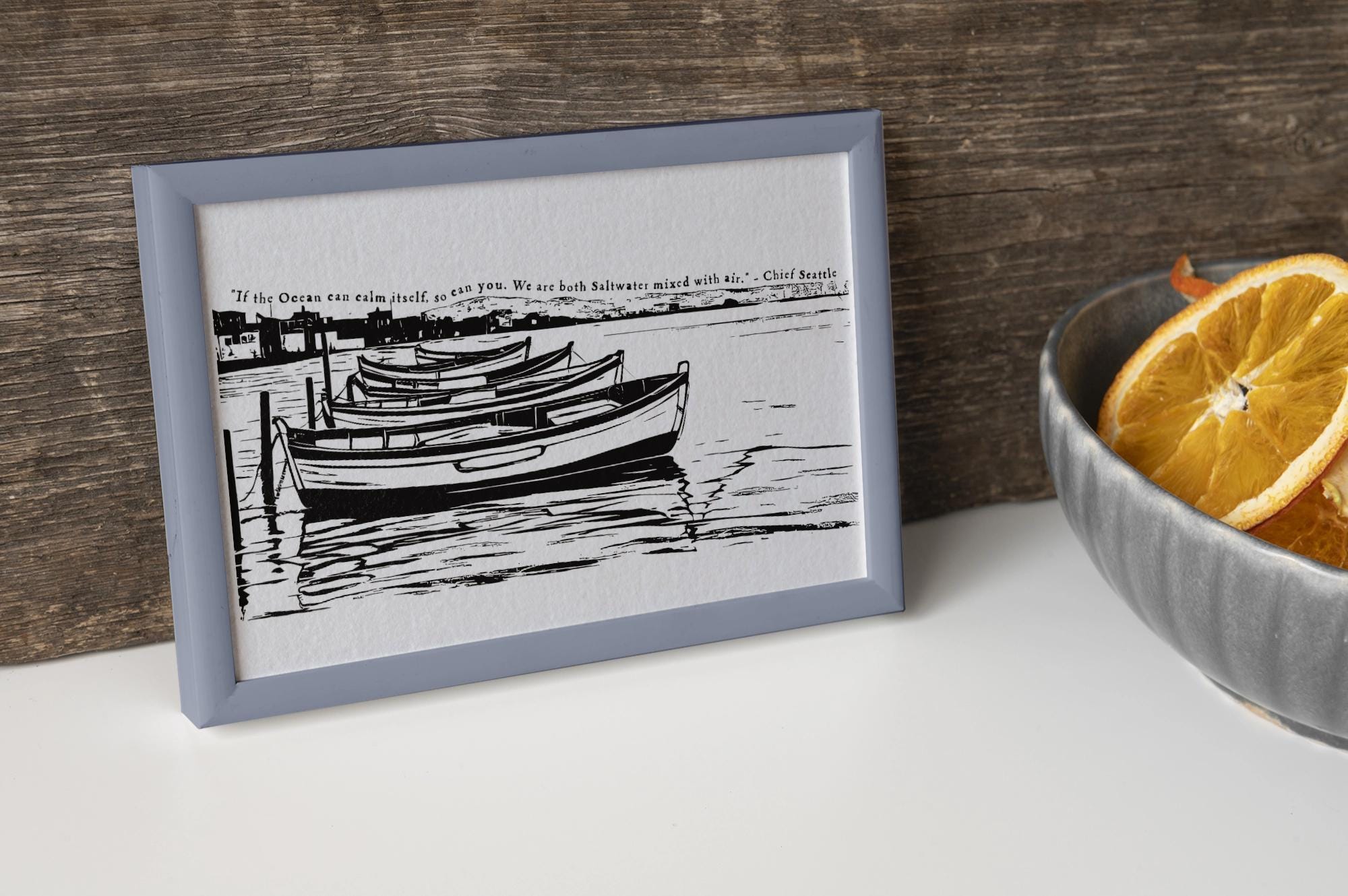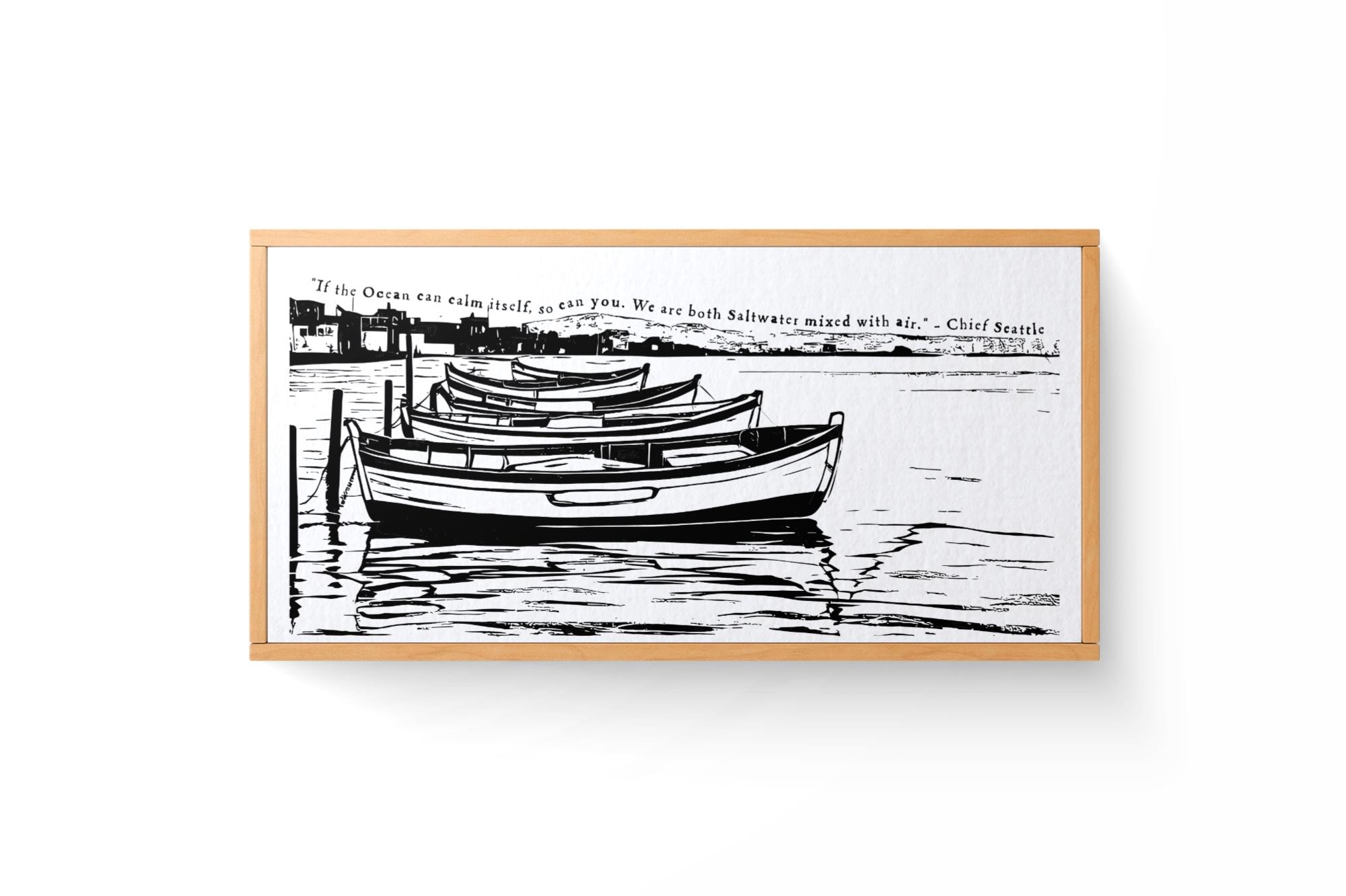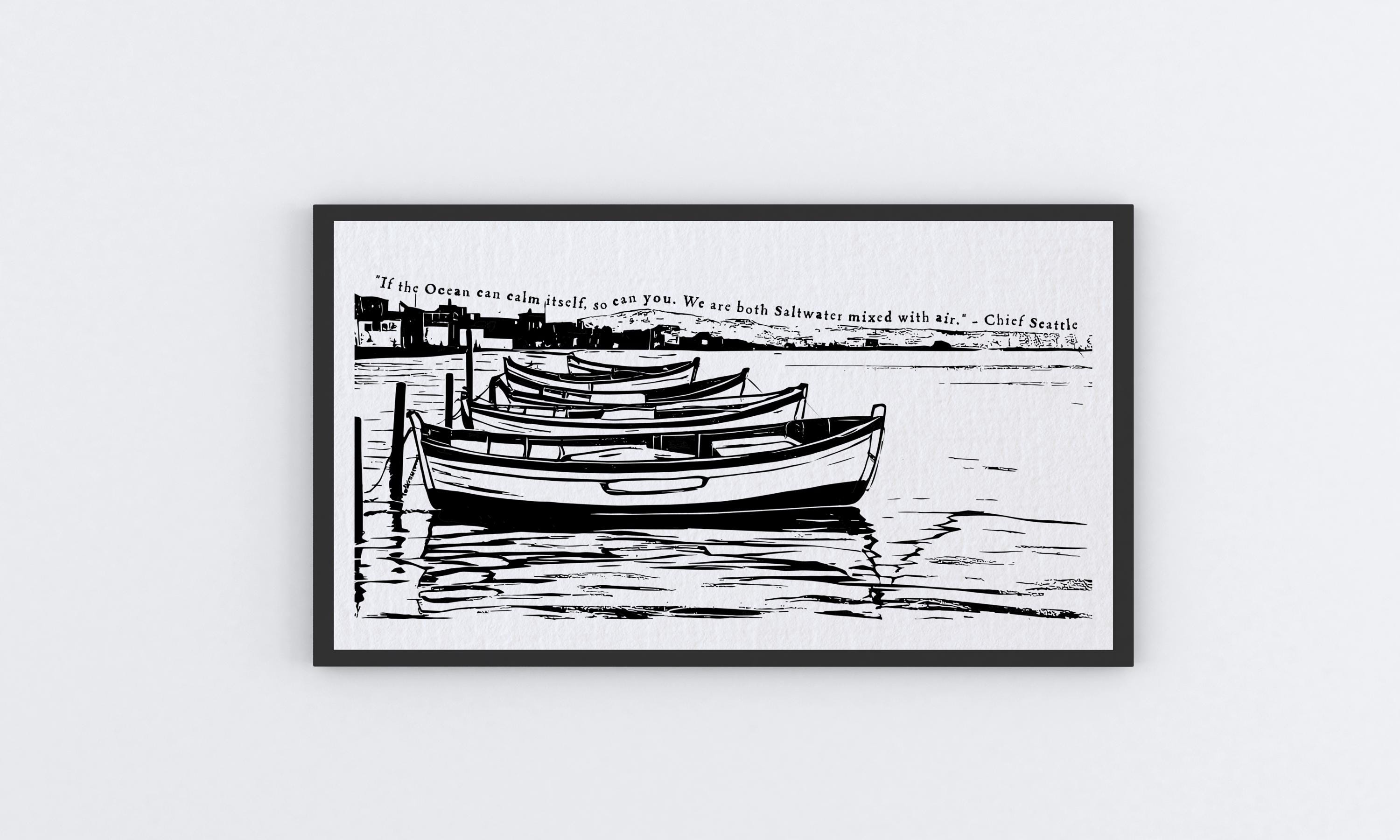 This artwork combines a powerful quote from Chief Seattle with an evocative illustration of boats gently resting on calm waters, symbolizing peace, reflection, and harmony with nature. It’s an ideal addition to your home or office décor, inspiring daily mindfulness and connection to our natural world.