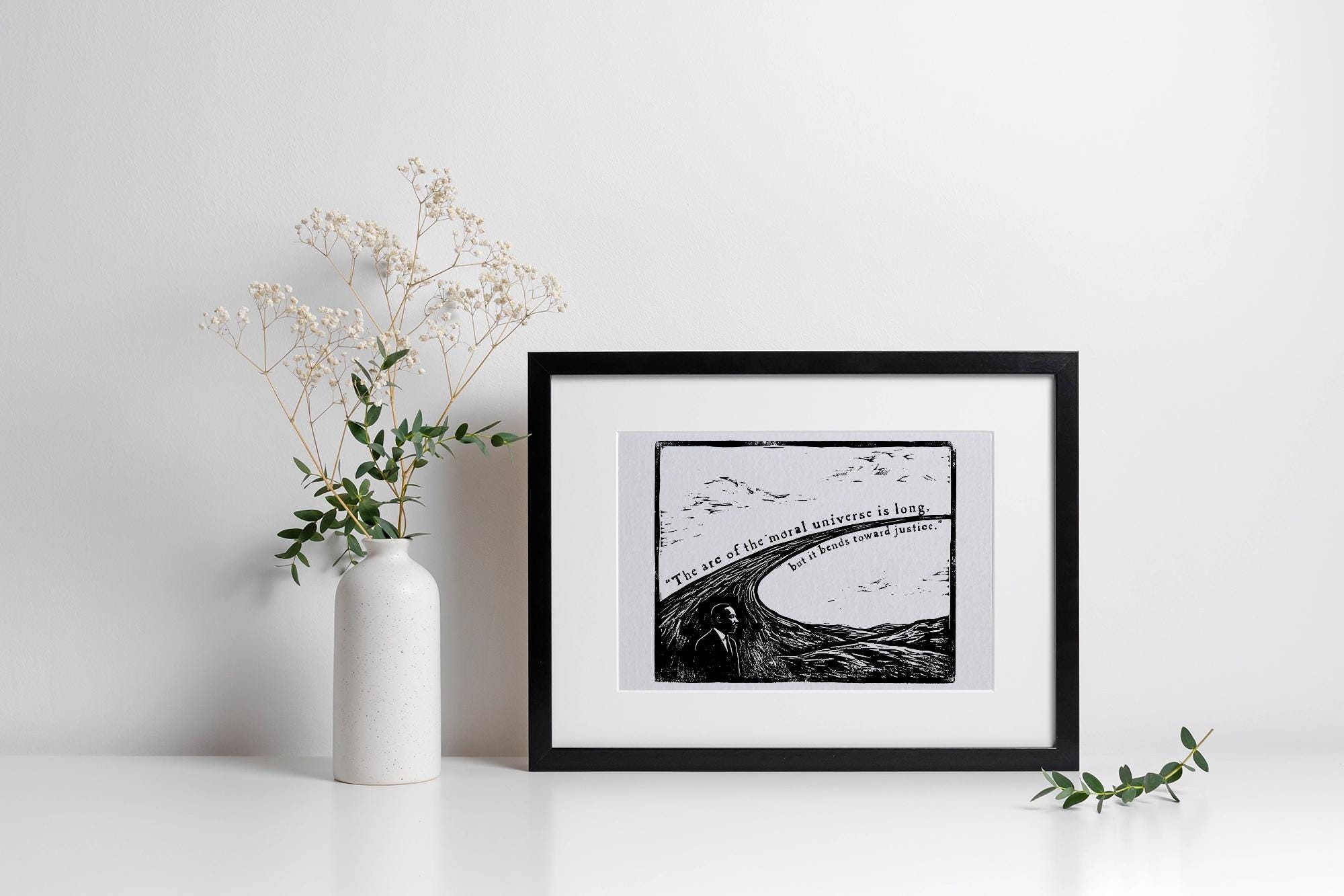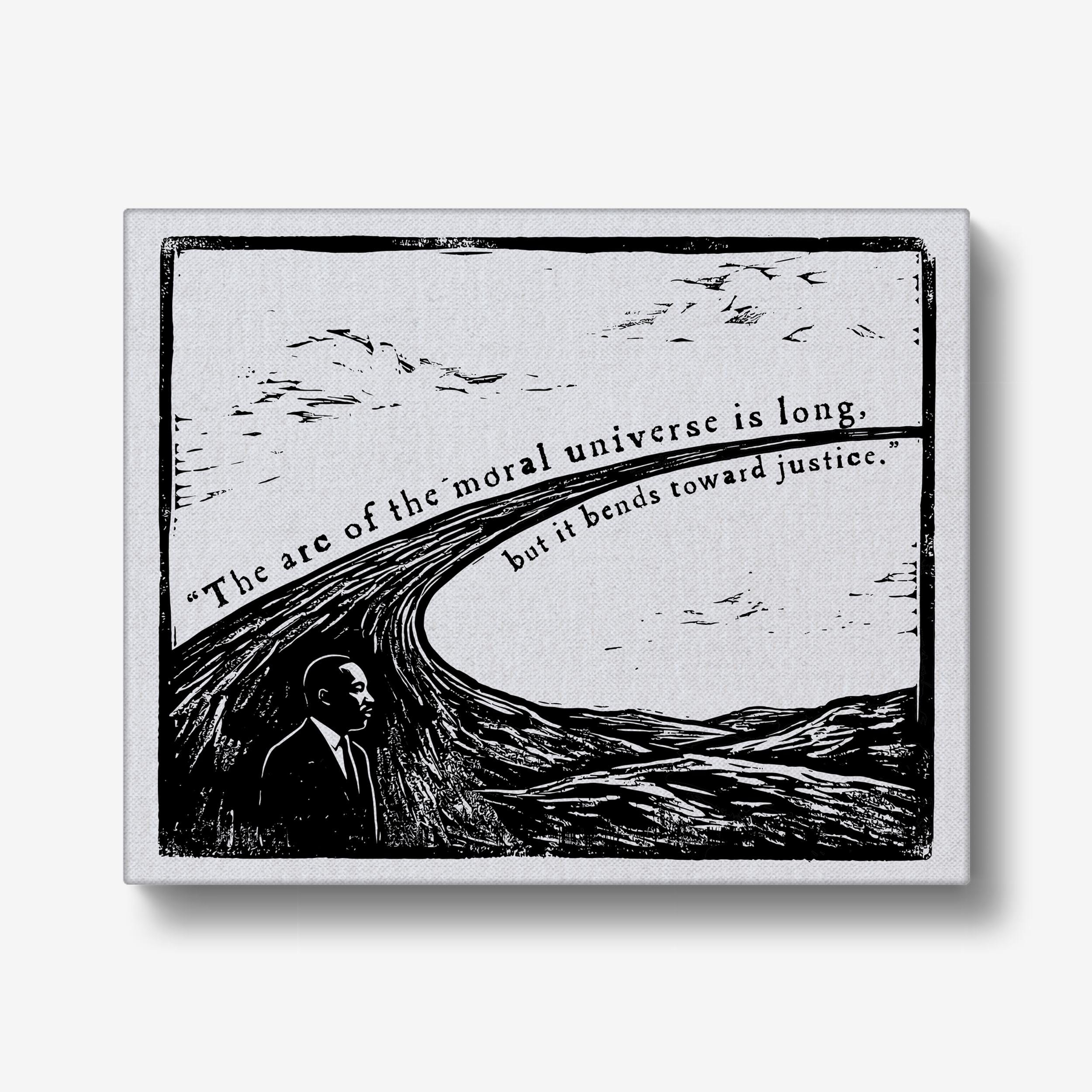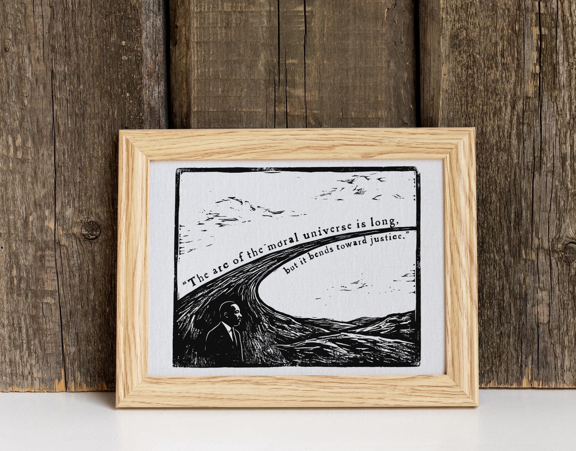 Add this timeless quote and captivating illustration to your collection or gift it to inspire others today. Elevate your space with this unique piece of literary and artistic craftsmanship that celebrates hope, progress, and the enduring arc of justice.