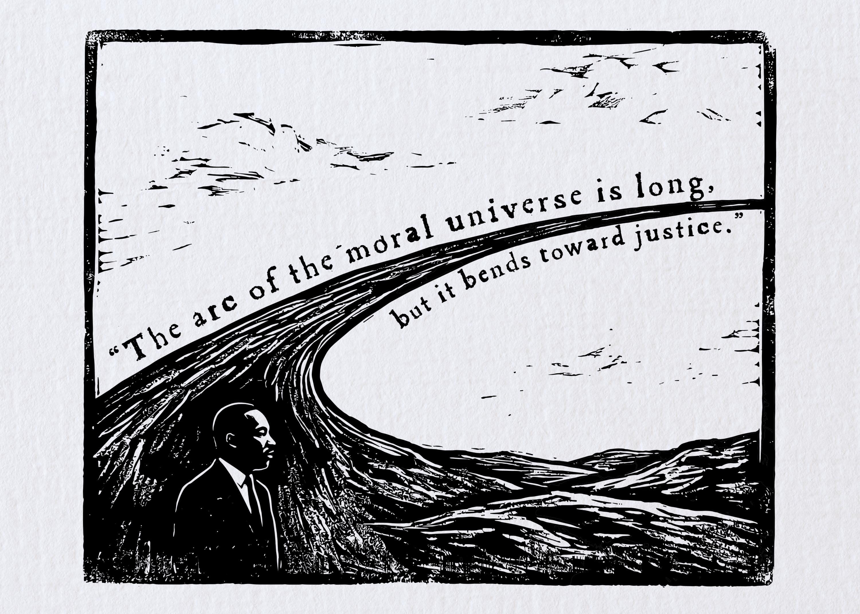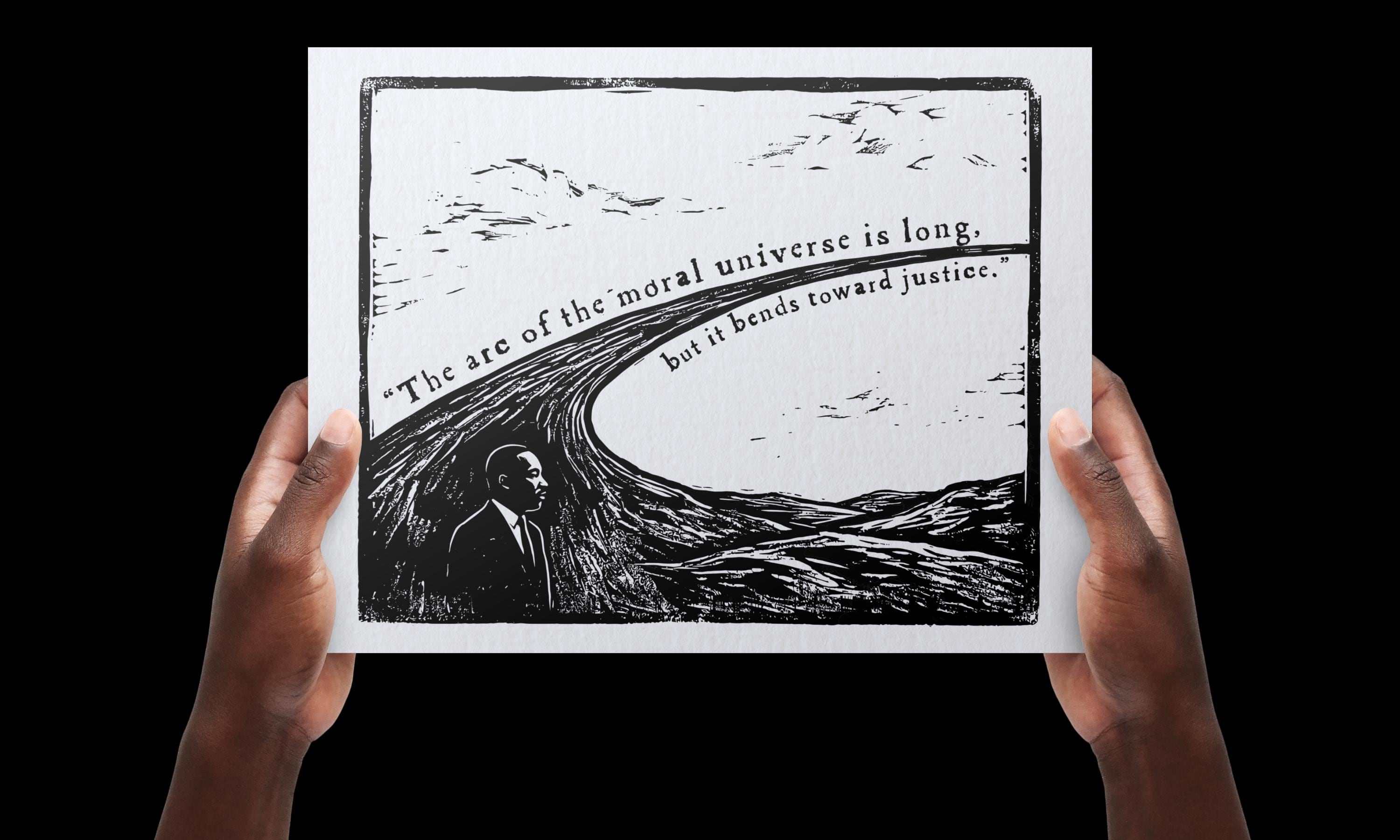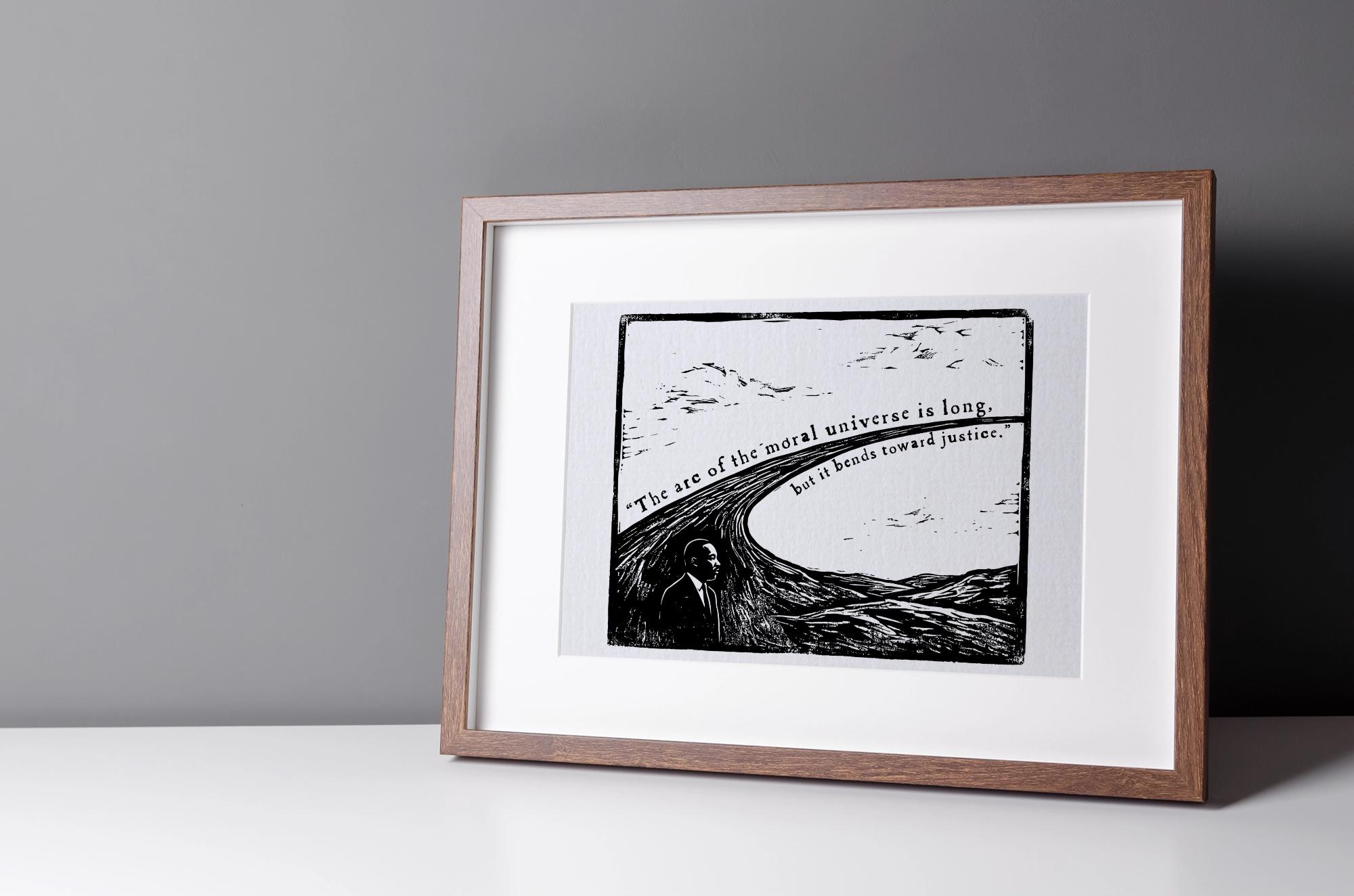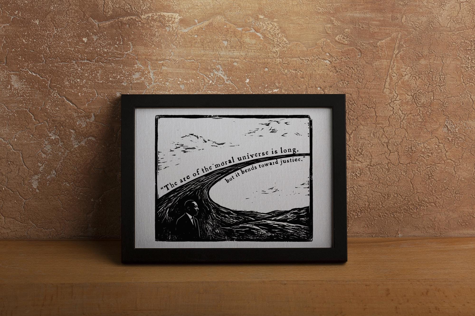 Add this timeless quote and captivating illustration to your collection or gift it to inspire others today. Elevate your space with this unique piece of literary and artistic craftsmanship that celebrates hope, progress, and the enduring arc of justice.